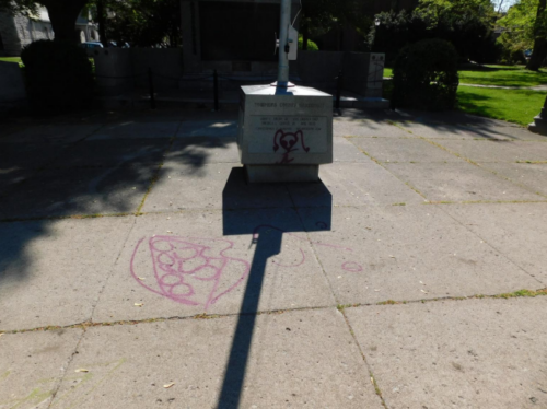 Police say the war memorial and nearby sidewalk at Dewitt Park was defiled early Sunday morning by graffiti. Images, words, and graffiti tags were spraypainted, but officers don’t know who’s responsible.