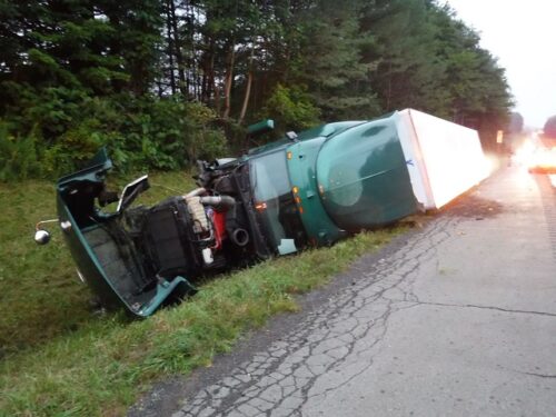 State Police at Homer responded to the southbound lane of Interstate-81 in the Town of Lapeer around 4:15 a.m. on Thursday. A tractor-trailer left the roadway and tipped over, rupturing its fuel tank, and spilling around 60 gallons of fuel. The driver, a 56-year-old man from Brooklyn, was transported to Wilson Hospital in Johnson City with non-life-threatening injuries.